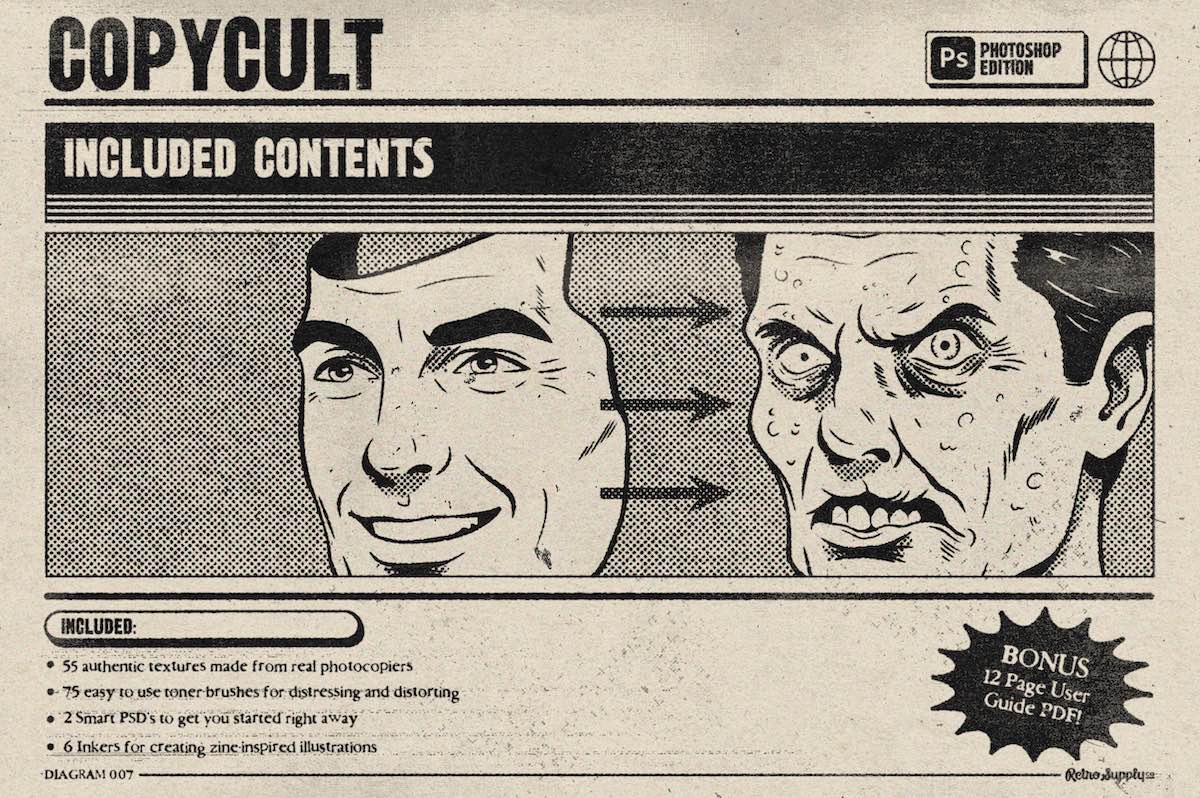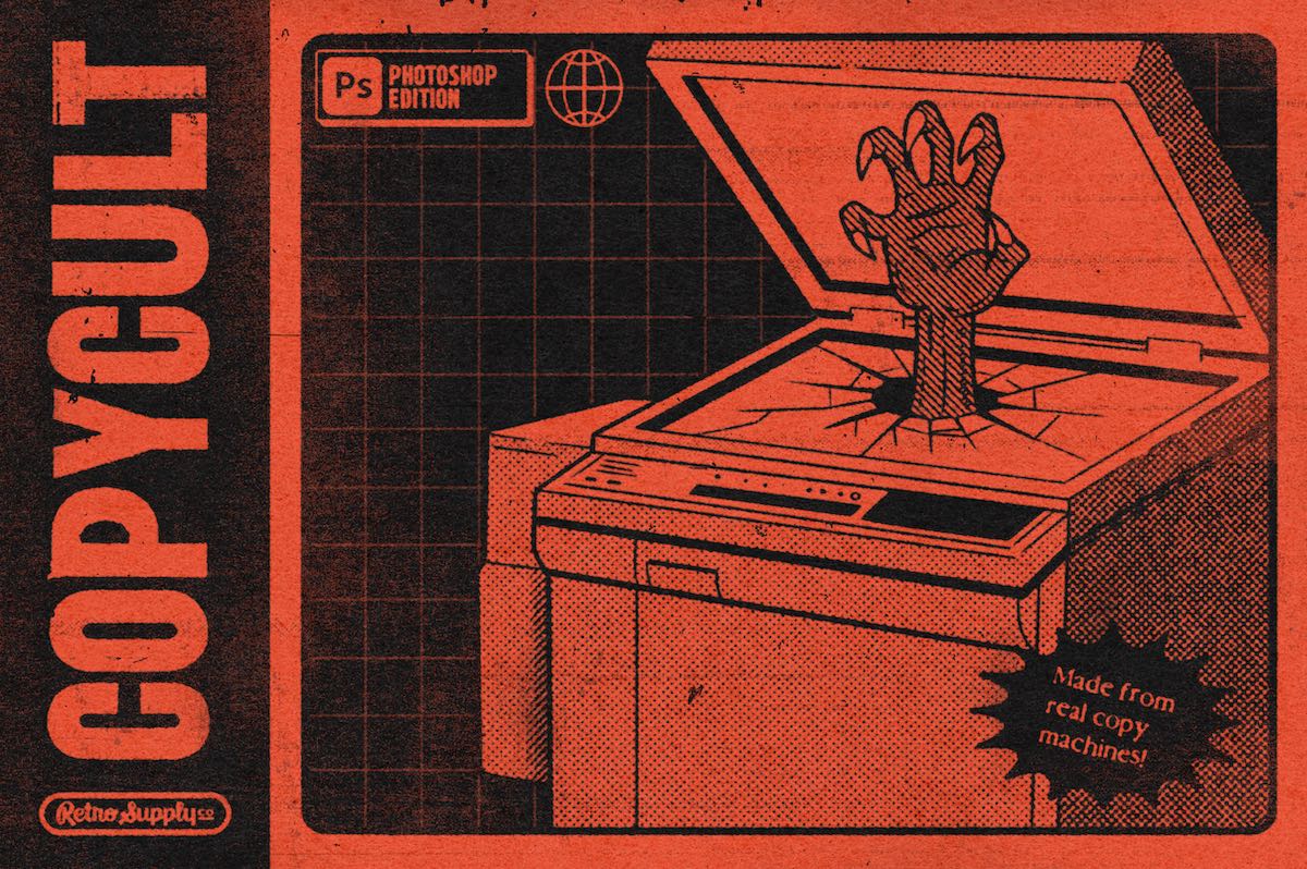From horror posters to photocopied band flyers, Copy Cult gives you real analog texture inside a Photoshop workflow.