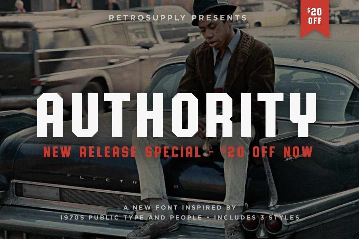 Inspired by public fonts used in school systems and transportation in 1970s New York. Authority is a bold headlines font that comes in 3 versions: Standard, Rounded and Distressed. Includes a total of 6 typefaces.