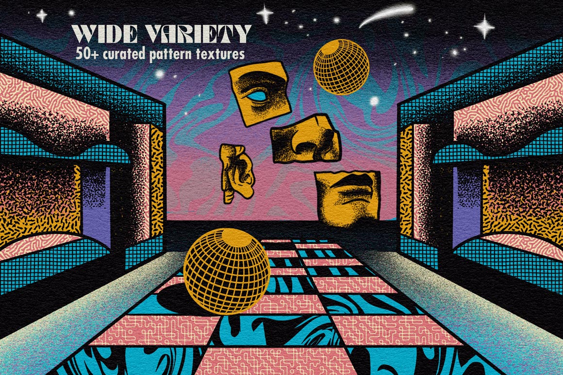 - Diverse swatches including white noise, netting, mazes, halftones, wonky grids and more!