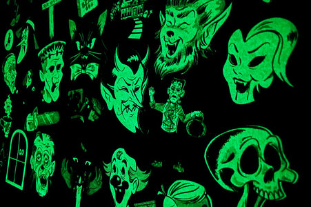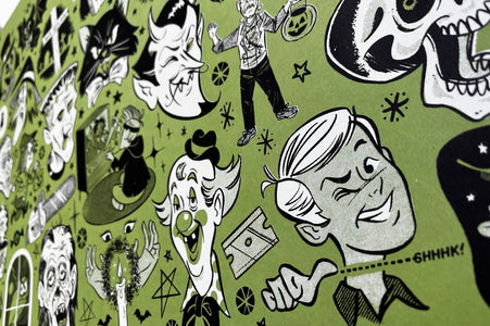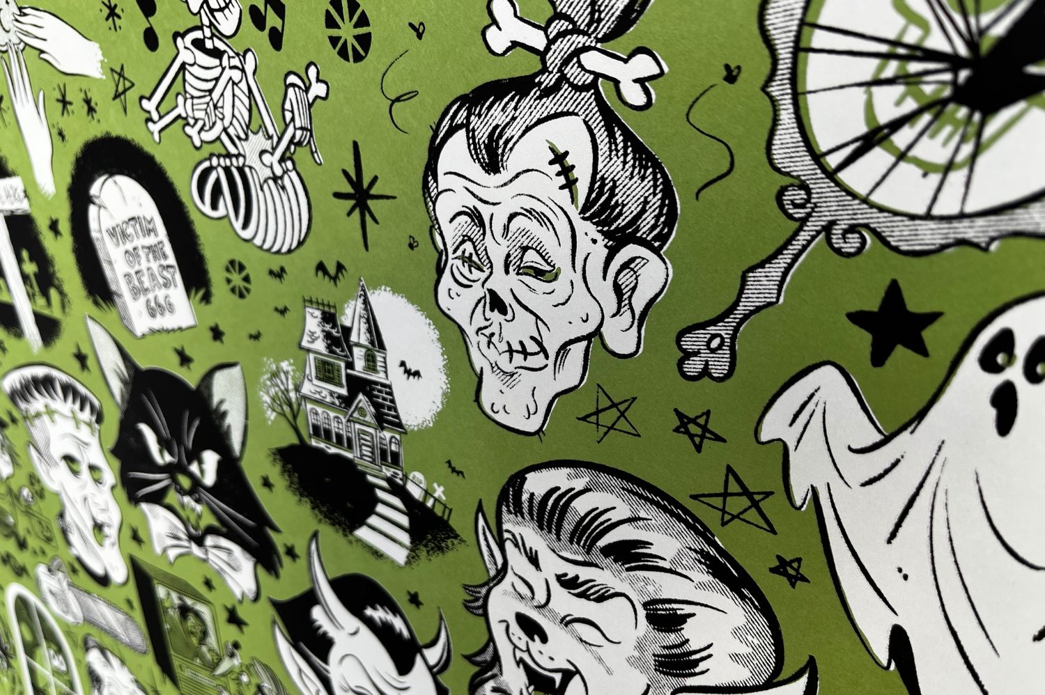 Printed on Pop-Tone Jelly Bean Green French Paper, each sheet was hand-pulled during a live print event, using glow-in-the-dark ink for a ghoulish after-hours effect.